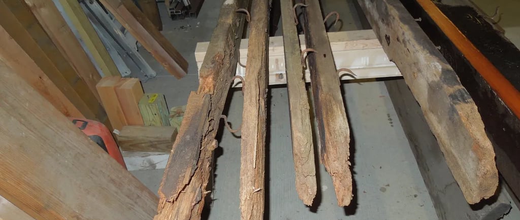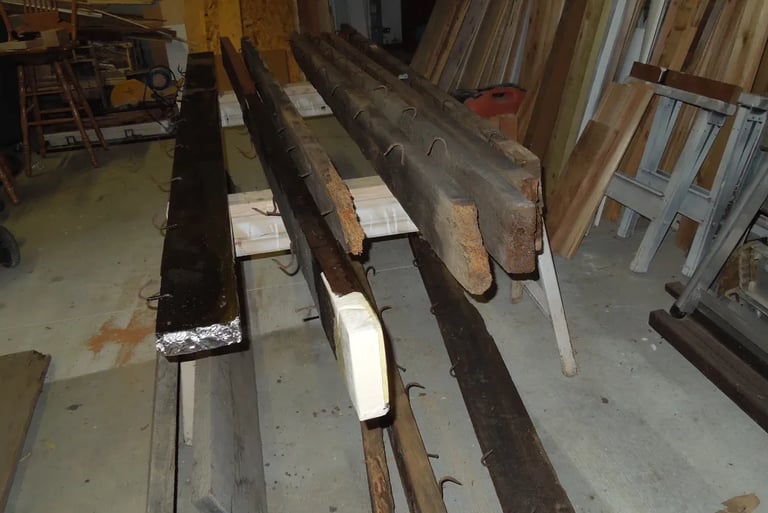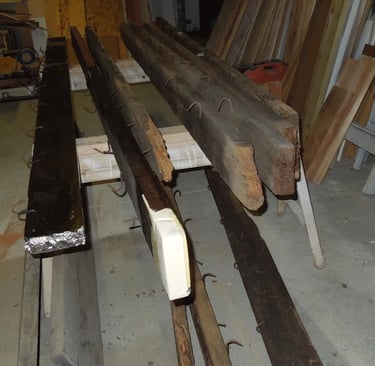 The open ceiling of the north section (section having stone floor) had 11 (2 by 6’s) 128″ long going lengthwise across the room. They were set in pockets in the stone wall and had hooks on the lower side. The hooks were made in the black smith shop (the center section). They were blackened with smoke from when that section was used as a smoke house. The boards (at least 141 years old) were very dry and parts were like powder with damage on the ends. Where the end of the board was damaged the board was cut on a taper and a new section was mitered on to the old board.