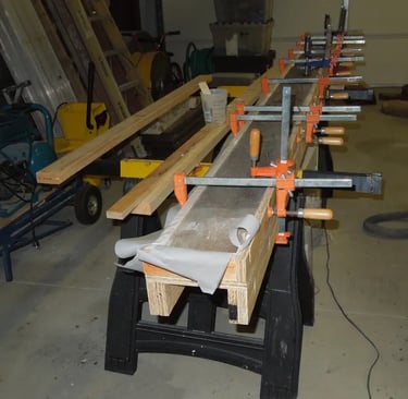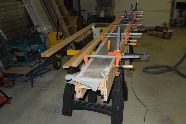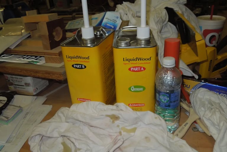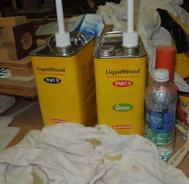 The pictures below show you the pre-restoration look, the mold with clamps, the restored board and the Liquid Wood, parts A & B used to restore the boards.