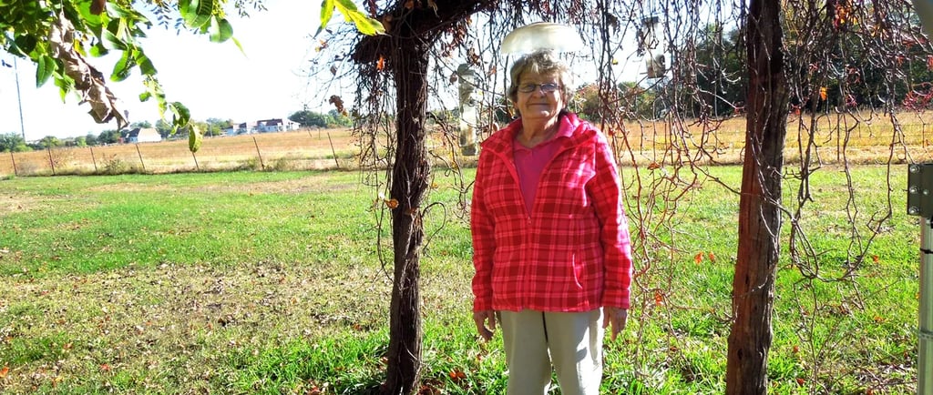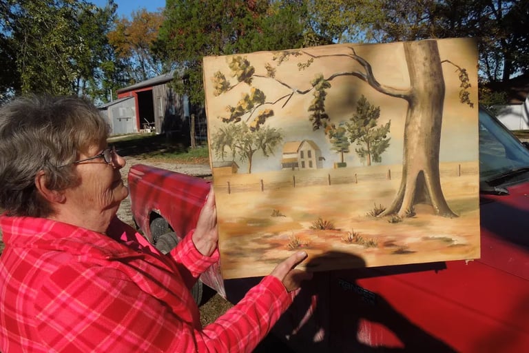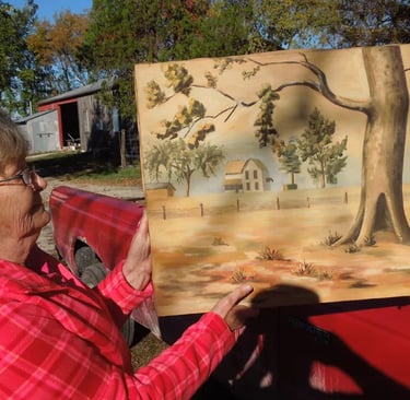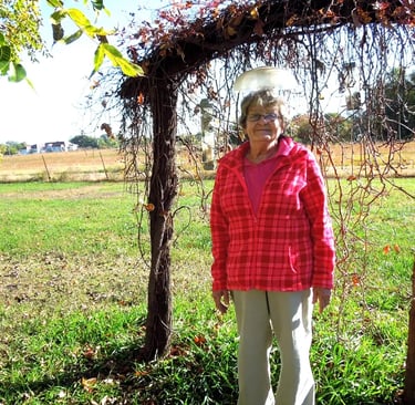 Rae is holding a picture her father (Harold Willits) painted of the old farmstead prior to the house burning in 1951. Rae is standing by the gate way that went into the garden.