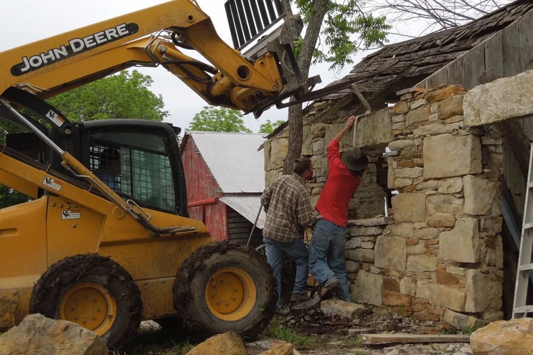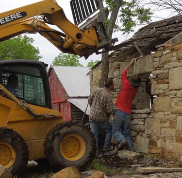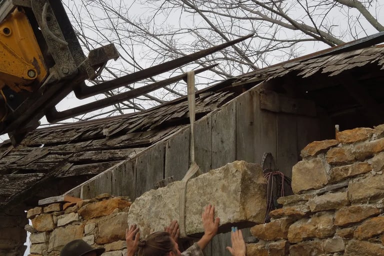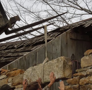 These are the two lintels on the East side of the building. The one over the door had fallen some time ago. The one over the window fell out when we were on the building last fall. When it fell it hit the iron wheel that the walnut tree had grown thru and the only tree I did not cut down next to the stone building.